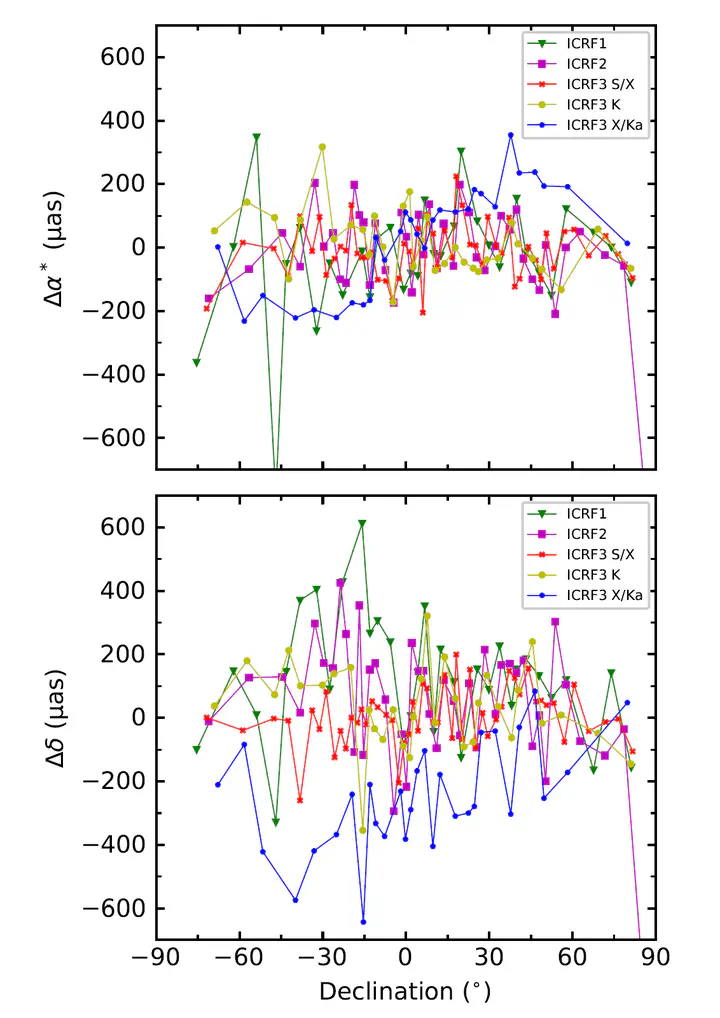Global systematics of ICRF3 against Gaia DR2 (Liu et al. 2020, A&A 634, A28)We investigate the overall properties of the ICRF3 using Gaia DR2 as an external reference. Comparing VLBI positions at S/X, K, and X/Ka with optical counterparts (G < 18.7), we analyze formal errors, declination dependence, and global systematics via vector spherical harmonics. The ICRF3 S/X-frame shows improved accuracy and near–zonal-error-free behavior, consistent with Gaia-CRF2. K and X/Ka frames achieve high formal precision but exhibit zonal systematics, including a significant glide along the Z-axis (>200 μas) in X/Ka, likely due to sparse observations and southern geometry.