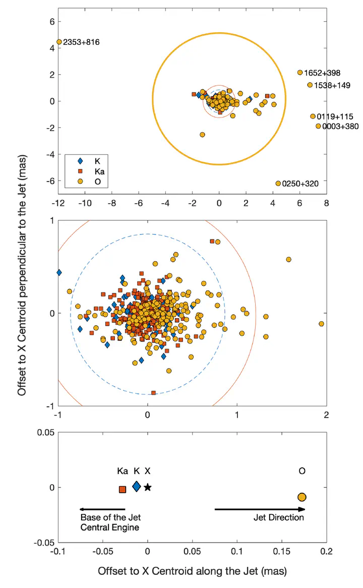 Alignment of radio–optical offsets with AGN jets (Lambert et al. 2021, A&A 651, A64)This paper investigates the relative positions of quasar emission centers at multiple wavelengths to link different realizations of the International Celestial Reference System (ICRS) and to reveal systematics and individual behaviors in active galactic nuclei (AGNs). Using the ICRF3 positions at X, K, and Ka bands, Gaia EDR3 optical positions, and MOJAVE jet kinematics for 194 sources, we examined the orientation between radio–optical offsets and the parsec-scale jet directions. The majority of sources exhibit radio-to-optical vectors aligned with their jets, with the optical centroid located downstream from the radio centroids. The K and Ka centroids are generally upstream relative to X, consistent with the core–jet model. Several optical centroids coincide with stationary radio components showing significant polarization, indicating synchrotron-dominated optical emission. These results confirm that multiwavelength astrometry can independently trace jet directions and that the ICRF3 X-band frame is stable and reliable.