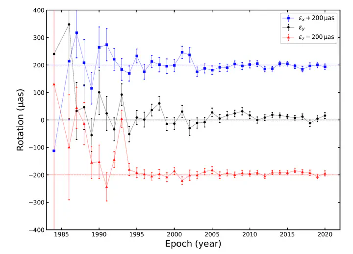 Axes stability of the ICRF3 from VLBI position time series (Liu et al. 2022, A&A 659, A75)Using very long baseline interferometry (VLBI) observations spanning 1979–2020, we evaluated the axis stability of the third realization of the International Celestial Reference Frame (ICRF3). Extragalactic source position time series were derived and analyzed to determine the global spin and yearly orientation of the frame axes. The global spin is less than 0.8 μas yr⁻¹ per axis, corresponding to an accumulated deformation under 30 μas. The dispersion of yearly frame orientations is typically 10–20 μas, confirming that the ICRF3 axes remain stable since its adoption.