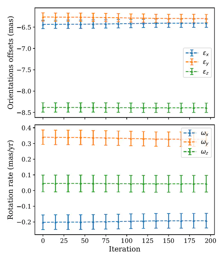Orientation offsets (~10 mas) from asteroid AL residual fits.We compare the optical Gaia celestial reference frame (Gaia-CRF3) with the dynamical reference frame defined by JPL’s planetary ephemerides using high-precision Gaia asteroid astrometry. From a cleaned sample of 1001 well-observed asteroids, least-squares fits to along-scan residuals yield orientation offsets of order ~10 mas and rotation rates < 0.5 mas yr⁻¹ in equatorial coordinates. Robustness checks (iterative transit rejection; model/sample variants) confirm the signal. When Gaia observations are included in orbit determination, the orientation offset drops to ~0.2 mas, indicating that historical asteroid astrometry (and catalog systematics therein) largely drives the larger offsets seen without Gaia.